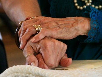 I am leaving a cafe late one morning and just outside the exit door are two older women, one clutching a walker, the other holding onto her arm. They are both wearing dresses long out of date, cotton day dresses, buttons down the front, one yellow, the other a gray check that may have once been blue.
